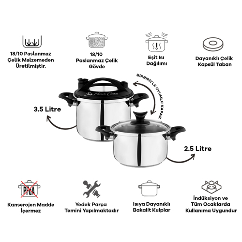 - Düdüklü tencereniz kullanışlı, güvenli ve çok kısık ocak ateşiyle size ekonomik pişirme sağlar.